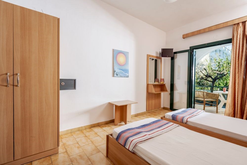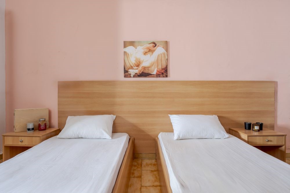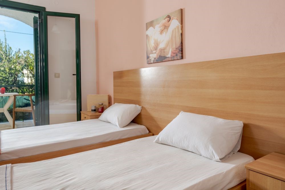 The Double or Triple Studios at Odysseas Studios are perfect for up to 3 guests. With a size of 25 sq.m., they feature two single beds that can be joined into a double, plus an extra bed for the third guest. Each studio includes a bathroom with shower, a kitchenette with mini fridge and cooking rings, and a private balcony for relaxing moments. Nine of the studios are located on the ground floor and the other nine on the first floor, offering options to suit different needs. Practicality and comfort blend to create a welcoming atmosphere for a pleasant summer stay.